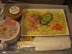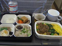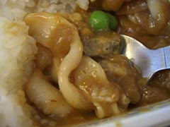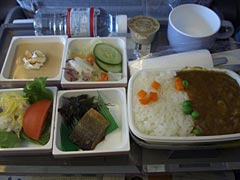 | 恒例機内食。シーフードカレー。 | カキとかイカとかいっぱい入っていた。おいしい。 |