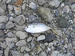 駅から徒歩で10分くらいのところを左折すると、すぐにコンパクトにまとまった海岸というか入り江が登場。おお、ここが地引き網会場となる大六海岸ですか。ハナウマ湾を1/10スケールに縮尺して、ジャパニーズスタイルにしたような感じで素敵。まさにプライベート地引き網会場。目の前のマンションが地引き網屋さんがいっていた「高いマンション」だな。ちなみに値段は高くないらしい。ちょっと欲しい。せっかくなので会場周辺をウロウロしてみる。砂浜というより、岩礁地帯っぽいので、メジナとかクロダイが捕れるとみた。魚釣りもできるみたい。でも当日は我慢しないとねえ。