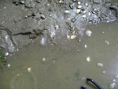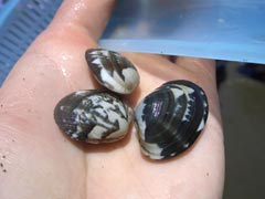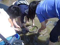 | 一掬いでこれくらい獲れる。 | 手づかみで大粒アサリを探すのが一番楽しい。 |