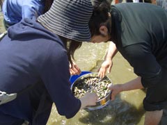 | シャベルでザックザックとザルに入れる。 | 砂を流せばそこには大量のアサリが。 |
