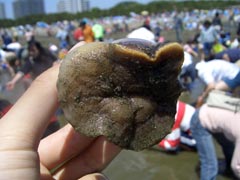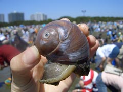 いやあ、潮干狩り楽しいなあと爪が割れるのを無視しながらモソモソアサリをまさぐっていたら、メンバーの一人が「カタツムリ!」といいながら(ジャンボタニシだっけ?)、見るからに怪しい巨大な巻き貝を持ってきた。おお、これはアサリに穴を開けて食べてしまう悪名高い「サキグロタマツメタガイ」じゃないですか。たぶん。現在「アサリの敵を食べちゃえ大運動」開催中なので、持って帰って誰かにそっと食べさせよう。