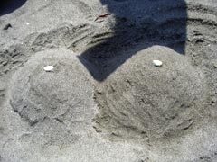 柴口から徒歩数分で海岸に到着。おお、なんかテレビで見た真夏の湘南海岸みたいな人口密度。明らかに潮干狩りの景色と異なる世界がここに広がっている。ああ、だめだこりゃ。アサリより人の方が多いに10点。でもまあやるだけやってみっぺやということで、荷物を革パンでやってきたアサリ拾う気ゼロの人に預け、麦わら帽子をかぶりサンダルに履き替えてズイズイと海の方へと歩いていくと、朝からやっているであろう人のバケツはすでにアサリで埋まっている。おお、アサリいるじゃんと足下の砂をよく見てみれば、これだけ人がいるのにそれでもアサリはゴロゴロ落ちている。誰かが撒いている訳でもないのにこの高アサリ指数。素晴らしいね海の公園。