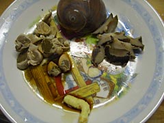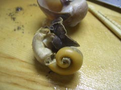 問題のサキグロタマツメタガイは、5分ほど茹でて流水で洗い、コンビニでもらったと思われるフランダースの犬のお皿に盛りつけて生姜醤油で食べてみた。なにやら黄色い蜷局を撒いた内臓が素敵。筋肉の部分はコリコリ、内臓の部分はモフモフしていて、味は「肉食のサザエ」といった感じ。濃い。臓物系珍味系発酵食品系が好きな人にはナカナカの珍味だと思う。