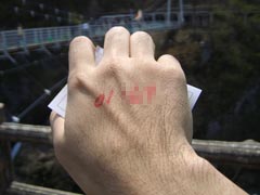 ジャンプチケットと右手の甲に、油性マジックで受付番号、体重を書いてもらったら受付は終了。今度は怪しげなおっさんがニヤニヤとやってきてバンジージャンプの飛び方レクチャーを始める。バンジーへの道のりは長いのだ。