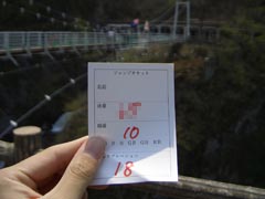 まあ生きていくっていう事は、毎日が橋の上から谷底へ飛び込むような危険と隣り合わせなんだから、バンジーはまだロープがあるだけマシだよねと自分を騙し、青息吐息で受付へレッツゴー。まず「死んだらごめんね」みたいな誓約書に泣きながら署名をしてバンジー代を払う。バンジーしているところの記念写真を強く進められるが、今回は心のシャッターだけに留めておく。続けて「隠さないで下さい!」と書かれた体重計で、「ほら、このジーパン、実は5キロあるから!」とか誰も聞いちゃいないのに無駄な言い訳をしながら体重測定。なんでも体重によってゴムの長さを調整するそうだ。で、そのゴムは受付に展示してあり、細い糸状のゴムを束ねて作ったものらしくなかなか丈夫そう。いや、丈夫そうじゃないと困るけれど。これなら、まあ、きっと、大丈夫だと信じよう。うん。死んだら死んだということで。ちなみに安全に谷底に落ちるのにかかる料金は5,775円と結構な額。朝日村の吊り橋から飛び降りる代金は、清水の舞台から飛び降りる気持ちで支払わないといけないのだ。