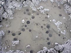 こうしちゃおれんと適当な場所を3年くらい前にディズニーランド近くで拾ったハンディー鍬で5センチくらい掘り返す。しばらくすると、泥水が澄んできて、びっくりするくらいたくさんの直径3センチほどの穴ぼこが表れる。干潟っていうやつは、ひと泥剥けば穴ぼこだらけらしい。初めて知ったよ。しかし、泥を掘るのってかなりきついっす。農作業用とかの大きい鍬が欲しいわん。自転車で運ぶの嫌だけれど。