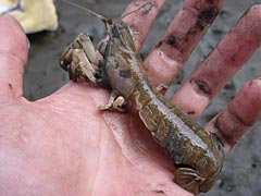 捕れた!逃げた!捕れた!逃げた!と一人アナジャコと格闘していたら、シャコ捕りにくるかもしれないといっていた友人より「迷子になりました」とメールが到着。おお、なんだ、本当にくるんだ。できれば干潟で泥遊びをしているときにメールとか電話は勘弁してほしい。携帯は防水じゃないのよ。G'zOneがでたら機種変更しようかなとか考えながら、「川沿いに歩けばそのうちたどり着く!」と的確なアドバイスをして電話を切る。シャコ捕りに夢中で人の迷子の世話なんかしてられない。シャコを捕まえたときの指先の感覚がたまらなく楽しいのだよ。