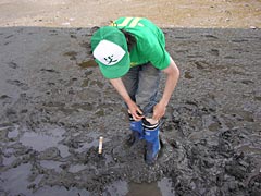 筆を買いにいっている間に、残された友人にぬかるんだ干潟をハンディ鍬で掘らせる。予想通り長靴が干潟に埋まって愉快愉快。転びそうで転ばないのが納得いかないが。さて、筆が足りないので、捕まえたシャコを洗濯バサミで挟んで穴に突っ込む「シャコの友釣り」というやつにチャレンジしてみた。いや、本当にそういう捕り方があるらしいんだわ。しかし、ここのシャコは好戦的ではないらしく作戦失敗。ちぇ。もっとガンガンぶつかってきやがれと勝手なことを思う。