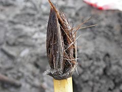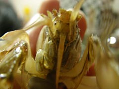 毛の部分まで押し出されてきた筆を見ると、なにやらシャコの爪らしきものがモゴモゴ動いているじゃないですか。いやーん。ええと、どうすればいいんだっけ、ううん、やっぱり素手であの爪を捕まえるんだよな。でもシャコって絶対挟むよな。まあいい、何事も経験だと左手で筆を立てて右手でむんずと毛の部分を掴む。む、手応えあり!おお、なんか指先に甲殻類っぽい物体があるよう。ど、どうしよう。引っ張れば抜けるのかな。ああ、でもシャコを泥穴から引っ張りだすための力加減が分からない。分かってたまるか。力一杯引っ張ったら爪だけもげるよな。ゆっくり、ゆっくり、がんばれ俺、そーっと、そーっと、痛い!イタタタタ!挟まれた〜!あー、シャコの爪がもげたー。悔し〜〜〜い。