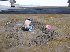 よし、じゃあいっちょやってみるかとシャコの潜んでいそうな穴(根拠なし)に筆を深々と差し込む。プシュ。お、どうやら穴は別の穴とつながっているらしく、筆を刺すと違う穴から噴水のように水が噴き出す。プシュ。楽しい。プシュプシュプシュ。設置完了。ええと、あとどうすればいいんだろ。とりあえず熊手で貝でも掘ろうかなと。ああ、ぬかるみに足が埋まっていくよう。うわ、無理に足を抜こうとしたら靴のマジックテープ部分が外れて靴が脱げた。うおう、マジックテープに目の細かい泥が詰まって、全然くっつかなくなっちゃった。干潟、恐るべし。ええい、もう裸足でいいや。牡蠣の殻とかフジツボとか落ちていてとっても危険だけれどまあいいさ。世の中には泥パックとかあるらしいし。ああ、裸足で干潟って気持ちいい。
