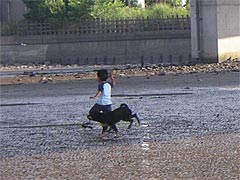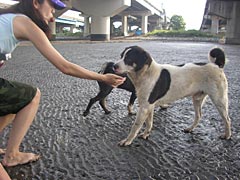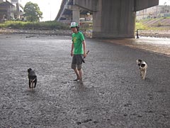 大人3人で干潟の穴に筆を突き刺してシャコをブイブイいわせて遊んでいると、たまにハゼ釣りや潮干狩りにきた人になにをしているのか根掘り葉掘りシャコ堀り聞かれる。関係ないけれど、「ピラニアの水槽に入れるための石」を拾いに来た人が、わざわざ自慢の石を見せにきたりもする。人もくるが犬もくる。ああ、俺のサラミ持っていきやがった。こらー。でもかわいいな。泥がいっぱいついた手で頭なでてやれ。えいえい。向こうでは子供が犬に追いかけられていて楽しそうだなと。子供、大泣きしているけれど。いやあ、干潟はいろいろな生き物がいるなあ。