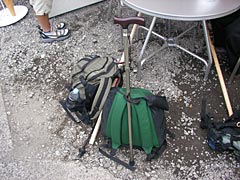 さて、富士登山に必要なものといえば、登山靴(T羽君は底の薄いスニーカーだが)、防寒着(N谷さんは忘れたが)、そして杖である。なんでも「金剛杖」とか「金剛棒」とか「ストロング金剛」とか呼ばれる六角の白木の杖が甲子園アルプススタンドののカチ割りの如くスタンダードな一品らしく、当然ここの売店でも売っている。ちなみに、なんども富士山に登っているN谷さん、F施さんは年期の入ったMy金剛杖を持参しており、道中ことあるごとにチャンバラごっこをしていたりする。お値段は、杖のみだと600円、鈴付き700円、旗(もちろん日の丸)鈴付き900円とそれほど高くはないのだけれど、この値段は標高に比例して高くなるので、必要な人はここで買っておいた方がお得らしい。しかし私はあえて金剛杖は買わず、ぱっと見「死んだおじいちゃんの形見」みたいな折りたたみ式の杖で富士登山にチャレンジだい。明らかに登山用じゃないけれど気にしない。どうせ血管年齢42歳、ヨボヨボの私にはこんな杖が似合っているさ。