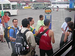 ここから富士登山を開始する「河口湖口五合目」へ向かう路線バスに乗り換える訳だが、乗り換えの時間が10分しかなく、その間に切符を買わねばならない。バスは一時間に一本しかでていないので、ここは一つスムーズな団体行動をせねばならぬのだが、そんな気持ちを萎えさせるのが、先にバスを待っている国際色豊かな富士登山隊。すでに到着している富士山行きのバスに乗り込もうと待ち構えている人達は、ぱっと見た感じで日本人より外国人の方が多く、冗談抜きでリュックサックを背負ったサリーとか、登山靴を履いたターバンとか、無秩序に20カ国くらいが揃っていやがる。さすが世に名高いフジヤマ、ゲイシャ。まあここで日本人の我々が焦ってもしょうがないということで、1時間後のバスでゆっくりいくことにしましょうか。