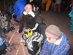 この辺まで来ると、周りの音は人の音だけで、周りの光はヘッドランプと山小屋の光だけ。頭の中には数日前から聞いているサンボマスターがうろ覚えでエンドレスループ。静寂の中、下界を見下ろすと、遠くに打ち上げ花火が小さく見えた。そうか、そういえば今日は江戸川の花火大会だったっけな。ってアレは多分違う花火大会か。上を見れば我が人生で五本の指に入る満点の星空が広がっている。北斗七星がくっきりと見え、ついでにその脇に小さく輝く、その星が見えると1年以内に死ぬといわれている(北斗の拳で)死兆星も見えてしまうほどの星空。星ってずいぶんいっぱいあるんだねえと素直に感心。N谷さんは「この星、全部名前がついているんだよねえ」と感心してる。確かに。天の川をはっきり見たのは山形に住んでいた頃以来だな。星座がわかる図が欲しい。歩きながらもつい見とれてしまい、うっかり石につまずいて転んで雪だるま式の大惨事になりかける。あ、流れ星だ。ごにょごにょごにょ。