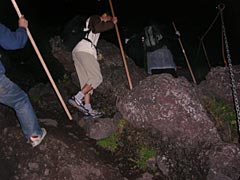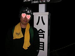 この辺にくると道も細くなり、だんだんと登山道が混んでくる。なので速く歩こうとしても無理。そんな気は毛頭ないけれど。流れに沿ってダラダラと登り、22時47分に八合目に無事到着。少し寒くなってきたのでフリースを着る。標識によると、頂上まであと2km、約180分の道程らしい。あれ、この調子だとだいぶ早く山頂付いちゃうな。やるな俺。しかし、たかだか2kmの道程で三時間かかるのか。さすが富士山。