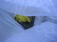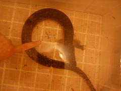 今日は一匹くらいはキープサイズを釣りたいなあと二本目の竿の準備をいそいそとしていたら、一本目の竿がリンリン激しく僕を呼ぶ。早いな。まだこの時間帯だとウナギには早いからセイゴ(スズキの小さいの)かなんかかなあとリールを巻くとすこぶる重い。なんでこんなに重いんだ。ああ、増水していたから重いオモリをつけたんだっけ。いや、そういうレベルじゃなくて重い。ヌルンヌルンと糸を引っ張る。あれもしかしてもしかして、もしかしちゃうのかしらと竿の弾力を目一杯使ってエイやっと抜き上げたら勢い良過ぎて仕掛けが後ろのフェンスまですっ飛んでしまった。あわわわっと駆け寄ると、手首までとはいわないがかなり太い、おもわず「さん」付けで呼びたくなるようなウナギさんがのたうちまわっているじゃないですか。うわ、自己最短記録で結構な大物が釣れてしまった。こんなんでいいのだろうか。まあ、釣れる時はこんなもんかとネットにいれてから水の入ったバケツに入れるのだが、どうがんばってウナギさんに無理な姿勢を強いることになってしまう。このままではまたすぐにお亡くなりになってしまい、前と同じく川臭い蒲焼きを食べることになってしまう。いかんいかん。あ、そうだ、そういえばリュックの中に大きなゴミ袋があったはずだ。それに入れちゃえ。えい、ブクブクブクブク〜(エアポンプのスイッチを入れた)。よし、これでバッチリと一人でウナギを見つめながら悦に浸る。ああ、幸せ。