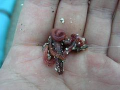 散歩から戻ってくると、いい意味で修行僧みたいなお兄ちゃんが釣り竿とミミズを持ってこっちにやってきて私に一言「ホームページやってませんか?」。う、なぜそれを。思わず「はい、すみません」と謝ってしまった。話を聞いたら富浦のボート釣りで検索したらこのサイトの「つりボートおきむら」の小話がでてきて、なんやかんやでここにウナギ釣りに来てみたそうだ。奇特な人もいるもんだ。で、写真に写っていた釣り道具から私の身元が割れてしまったらしい。声をかけていただけれるのはうれしいのですが、細かいポイントとかは聞かれても毎回違うところに投げているのでよくわかりませんごめんなさい。で、いろいろ話をしていくうちに、彼の住んでいる場所が、以前に私がここで釣りをしているとき、通りすがりの「うなぎ釣り歴40年」みたいなオッさんに「ここは釣れないから○○がいいぞ!」って教わった憧れの場所でちょっと面白かった。