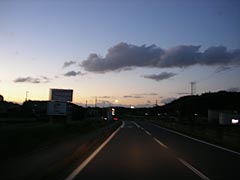 | 途中の釣り具屋さん。 | 夜明けのドライブ。この平野道が好き。 |