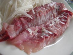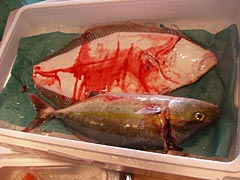 | ほとんど売り切れだ。 | 締められたカンパチとヒラメ。 |