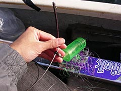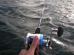 渡る世間はイシモチばかり。どうせならちゃんとイシモチ仕掛けに食ってくれないかなあと、アジ竿を膝の上に置き、イシモチの仕掛けを新しいものに変えようとハサミで古い仕掛けをぱちんと切る。ひゅるるるる。あ・・・。イシモチの仕掛けと一緒にアジ竿の道糸も切っちゃった・・・。うわああああああ。
