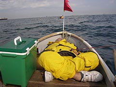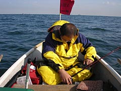 途中コンビニに寄りつつ、午前6時半、石田ボートに到着。ここのボート屋は冬場の営業が7時からなのでちょうどいい時間だねと。早速受付を済ましてボートに乗船。狙いは当然アジとイシモチ。オール係は私以上にアルコールが残っている気がするOさんだ。でもきっと大丈夫。うん。きっと。航路を走る釣り船の波しぶきを景気よく浴びたけれど大丈夫。うんうん。