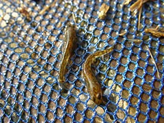 ドキドキしながら草の根元に網をガシガシと突っ込んでみると、一発目からハゼの仲間らしき魚が捕れた。とてもうれしい。でもちょっと小さすぎるのでリリース。しかし、この網でガシガシ魚を捕るという行為を物心ついた時から延々と続けているのだが、いくつになっても楽しいなあ。あ、なんかエビが捕れた。うひょひょ。うわ、ザリガニもいるじゃん。おお、さっきのより大きなハゼもいる。なんだか美しいハゼだけれど、天然記念物とか絶滅危惧種とかの類じゃないよな。亀本さんの食事にするので、どこにでもいるありふれた生き物であって欲しいのだが。まあ、なんでもいいか。いやあ、楽しい。