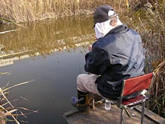 池の周りの細い小道を歩いていたら、釣りをしているじいさん発見。葦が茂っていて気がつかなかったが、よく見たらじいさんがそこら中で釣り糸を垂れているじゃないか。いいなあ。気の良さそうなじいさんにちょっくら話を聞くと、ここはフナやらクチボソやらが釣れるらしい。フナ釣りは私の釣りの原点なのだが最近は全然やってないな。ううん、楽しそう。