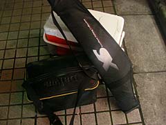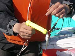 だがしかーし、マゴチの餌に使っていた金魚、さすがに淡水育ちらしく、海水に沈めるとすぐにお亡くなりになってしまうことが判明。あ〜あ。やっぱり自分でハゼ釣ってこなきゃダメかしらね。で〜も大丈夫。元々マゴチなんていう魚は、自分で釣ったシロギスとかメゴチを餌に釣るもんだ。こんなこともあろうかと、某修行僧が「ウナギ釣りに最適!」とやたら絶賛している「はずしっこIII」を買ってきたので、釣った餌魚を触らずに針をはずせるぜ。引き金を引けば一発だ。
