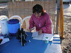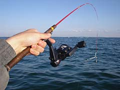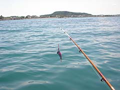 マゴチの仕掛けをセットしたところで、暇つぶし兼マゴチの餌確保として、シロギス釣りを開始。本日は浅場での釣りとなるので、タックルは堅めのワカサギ竿(堅めといってもフニャフニャだが)に小型スピニングリールという、私が去年開発した「ライトタックルで攻める浅場のシロギス」を実践。道糸は前回の反省を踏まえてのナイロン2.5号、オモリはがんばって8号を背負っていただく。これを誘導式天秤と組み合わせると、どんな小さいピンギスでもビンビンにアタリが伝わってきて面白いんだよね。っておもったんだけれど、PEラインじゃなくてナイロンにしたので感度イマイチ。うーん、改良の余地あり。でもやっぱり、釣れたときのヒキの楽しさはライトタックルならではでございます。この道具でカワハギとか釣れないかなあ。
