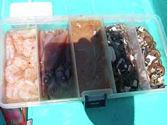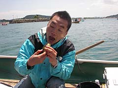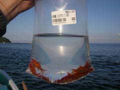 はい、ポイント到着。曳舟から放たれたところで、ホテイさんがシーアンカーとかパラシュートアンカーとかいう、ボート釣りにおける流し釣りの秘密兵器を取り出す。これをいれると、ボートがゆっくり流されるので広い範囲をゆっくりと探ることができるそうだ。そしてさらに本日のビックリドッキリメカ、「餌金」こと小赤ちゃん登場。金魚だ金魚。この餌金というのは、熱帯魚屋とかで、大型肉食魚の餌として安く売られているものなのだが、実はマゴチ釣りにも最適なのではという大胆予想の元、ホテイさんに買ってきてもらったんだよね。ぐへへへへ。こいつをマゴチ仕掛けの針に刺して、あら、ちょっと金魚が小さいかな。でもまあいいかと海にちゃぽん。これでマゴチは釣れたも同然。ホテイさんはなにを狙っているのかなと見ると、なんかすごいいろいろな餌を持ってきているじゃないですかい。アマエビにホタルイカに塩辛にジャリメにアオイソメって何事ですか。さらに生きたドジョウまで持ってきているし。やるなホテイ。手巻き寿司の材料みたい。竿はなぜかヘチ用だし、謎の多き男よ。
