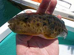 ええい、撤収となったところで、修行僧がニコニコしながらボートを寄せてきて、「これ食べる?」と差し出してきたのは、あこがれの食材、ヒガンフグ。たぶん。おお、こいつはショウサイフグより美味しいんだよなって素人の私が捌くのはとてもとても危険な気がするので、修行僧にそのまま食べていただこう。いや、食べないけれど。