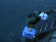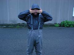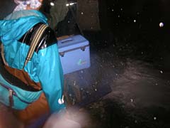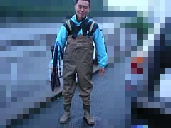 ここから先は歩いて海を渡らないといけないということなので、ウェーダーという腰まである長靴を履き、さらにゴアテックスの新品カッパを着込んで、全方向防水な格好になる。準備万端である。そしてふと気がつくと、Dちゃんともう一人、どこかでお逢いしたことのあるような方が準備万端でたたずんでいた。あれ、いつのまに。