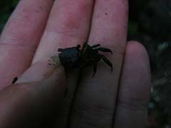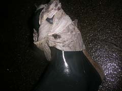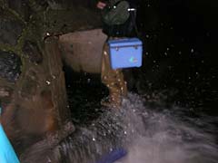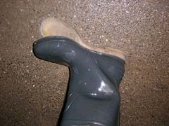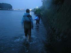まずは雨がザーザーと降りまくる中、クロダイ狙いのDちゃんのためにカニを捕まえます。暗闇でカニを捕まえるのはなかなか至難の業です。そして、釣り場へと渡るためにヘッドライトをして移動。膝くらいまで海水に浸かりながら暗闇をいくのですが、足下がとても悪く、足首を捻りまくりです。そんなときに限ってウェーダーの靴底が剥がれます。海中歩きづらいったらありゃしない。最悪です。