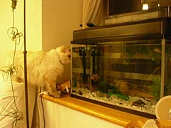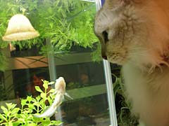 | 水槽の中にいるのではなく、水槽の裏に回っている。 | ダボハゼにも興味津々。 |