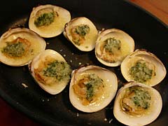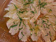 | ソイとメバルのカルパッチョ。 | 蛤のエスカルゴ風。 |