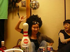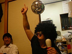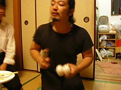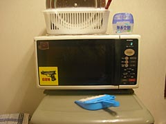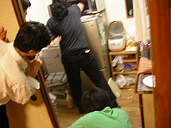 程々にお酒も廻ってきて、カツラとサングラスをつけて記念撮影したり、家主所有のレトルトハンバーグをよく揉んでおいたりという引っ越し祝いならではの光景が繰り広げられる中、美味しいグリーンカレーをつくってくれたNさんが「そろそろ爆発いってみようか」といいながら立ち上がり、すごい楽しそうに生卵を3つほど電子レンジに入れて2分ほど加熱しだした。おおこれは、昔々に探偵ナイトスクープという関西では誰もが見ている超メジャーお笑い番組、関東だとマニアック深夜番組でやっていた「卵爆弾」じゃないか。なぜか今日ここにいる人達のほとんどがその放送を見て覚えていたことが謎だ。これも運命ってやつか。卵爆弾って、確か生卵を電子レンジで適度に加熱すると、それを食べようと殻を剥いた瞬間に卵が爆発するという、死なない程度にデンジャラスな卵料理だったような。あの放送を見て以来、ぜひ一度試してみたいと思っていたのだが、そんな危険なことを自分の家では絶対やりたくないし、かといってよそ様の家でやる程の度胸ものない。それをNさんは「引っ越し祝い」としてリフォーム仕立ての台所でやろうとしている。うーん、男らしいとはこういうことをいうのだろう。私の引っ越し祝いでは拒絶させていただくが。もちろんそんなNさんの暴挙を止めようとする人はこの部屋にいない。家主のトリ君は卵爆弾というものを理解しておらず、みんながウキウキしているのをキョトンと眺めている。知らぬが仏。