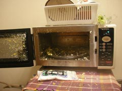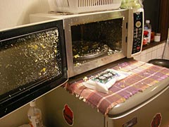 | 電子レンジの蓋が開く破壊力。 | 飛び散る卵の破片。 |