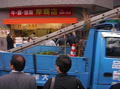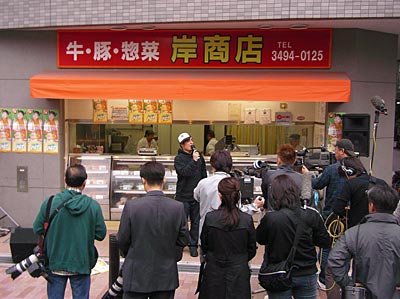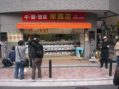 まずはイベント開始前の写真です。肉屋の前にスピーカー、シュールです。 向かって右側の帽子の人が司会の冠さんです。かっこいいです。 |