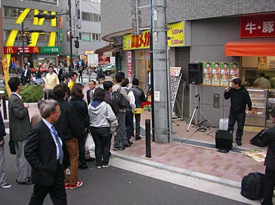 司会進行は冠さん。スピーカーから五反田の街に美声が大音量で響き渡ります。 |