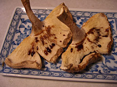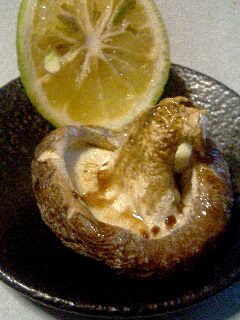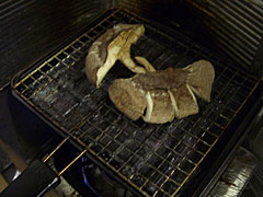 | 単純に焼く。 | 焼き椎茸。焼くと縮む。でもデカイ。 |