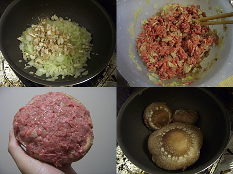 | 左上、タマネギと椎茸の軸をいためる。あれ、炒める必要あったっけ。 右上、合挽きとあわせて練る。塩、胡椒、適当な香草もいれる。 左下、椎茸に力一杯詰め込む。重い。 右下、フライパンで無理矢理焼く。 |