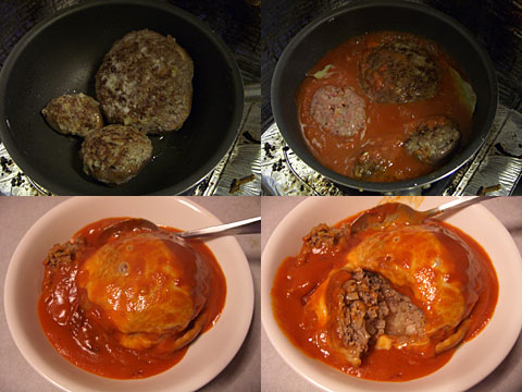 | 左上、引っくり返してみる。おお、美味しそう。でも火が通らない気がする。 右上、なので煮込む。トマトピューレ投入。水煮缶と間違えて缶詰空けてしまった。まあいいや。余っている肉もいれちゃえ。月桂樹もいれとけ。 左下、お皿に盛って、チーズを一切れ乗っけて煮汁かける。 右下、ちゃんと火が通っているなと。 |